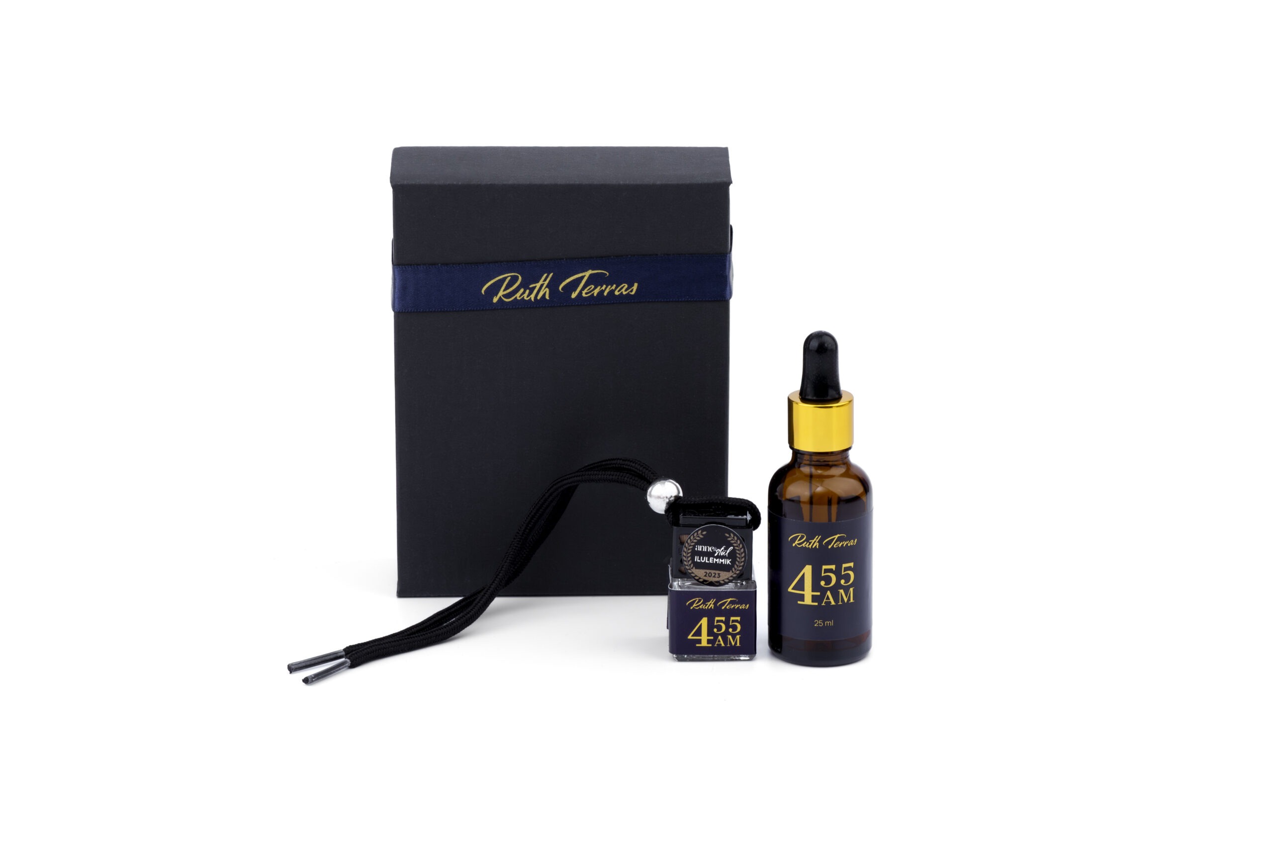 Komplekti kuuluvad 4.55 AM Pure and Daring 5,5 ml autolõhnastaja ja lisaks 25 ml autolõhnastaja täide.