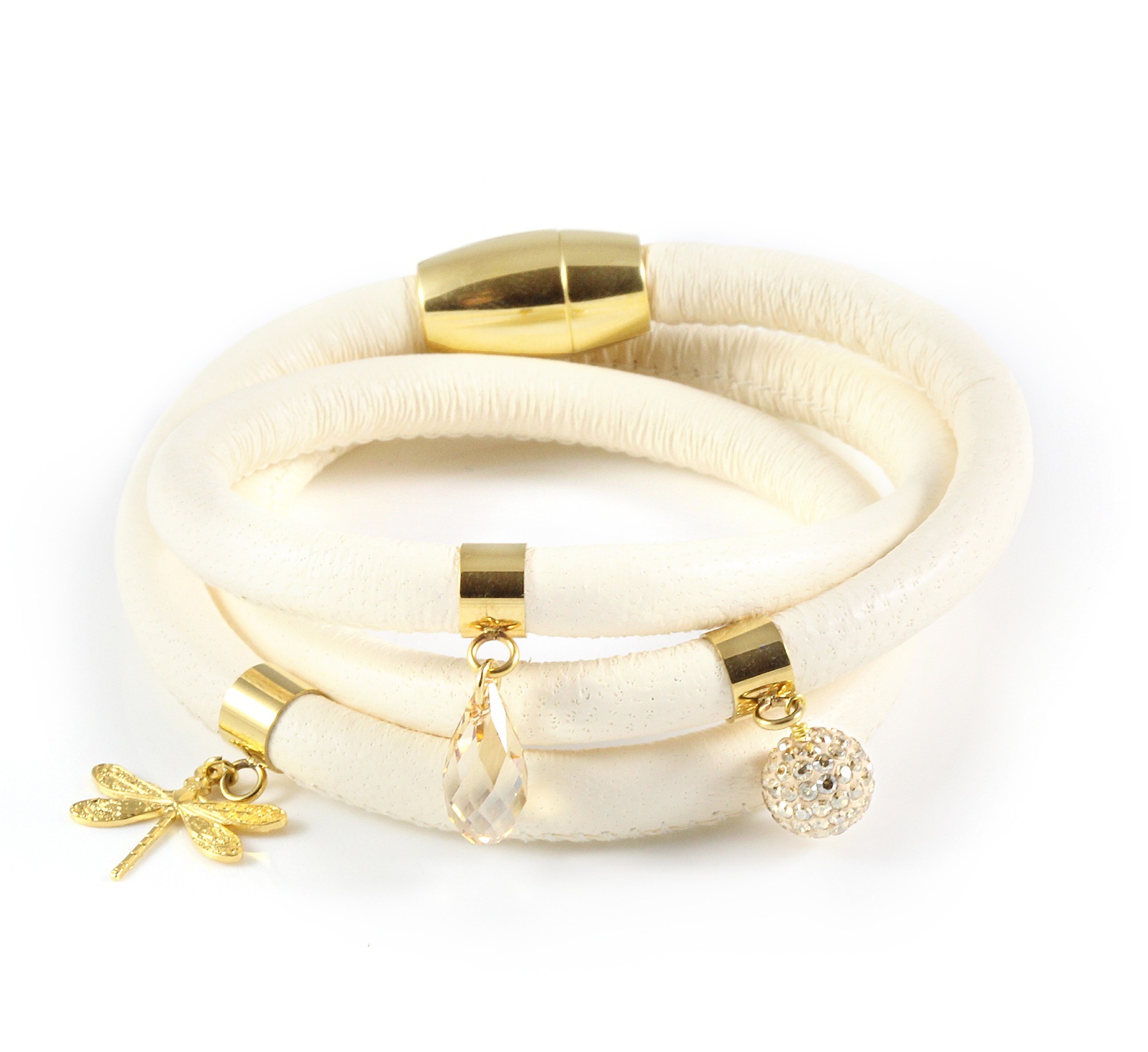 With a perfect hint of sparkle and glam this cream triple wrap leather bracelet will make you stand out in the crowd. It is decorated with a 22-karat gold plated dragonfly and a sparkling Swarovski crystal drop and ball. The magnetic lock makes it easy to put on and to take off.