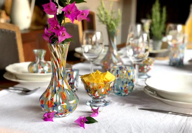 Colourful hand-made blown glass vases is the perfect accessory to bring colour and joy to your table, transparent crystal glass and lively coloured glass grits.