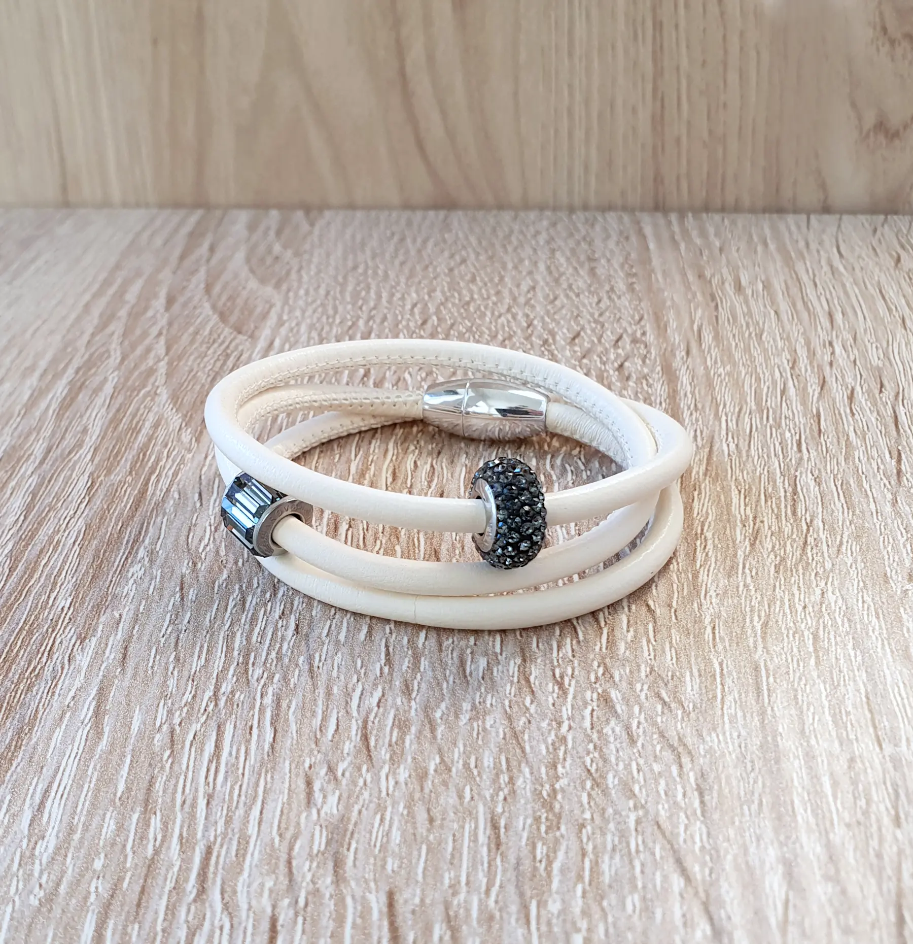 This cream triple-wrap leather bracelet, embellished with sparkling Black Diamond Austrian pavé crystals, is an eye-catching addition to any chic outfit. The magnetic lock makes it easy to put on and take off. An excellent gift for special occasions.