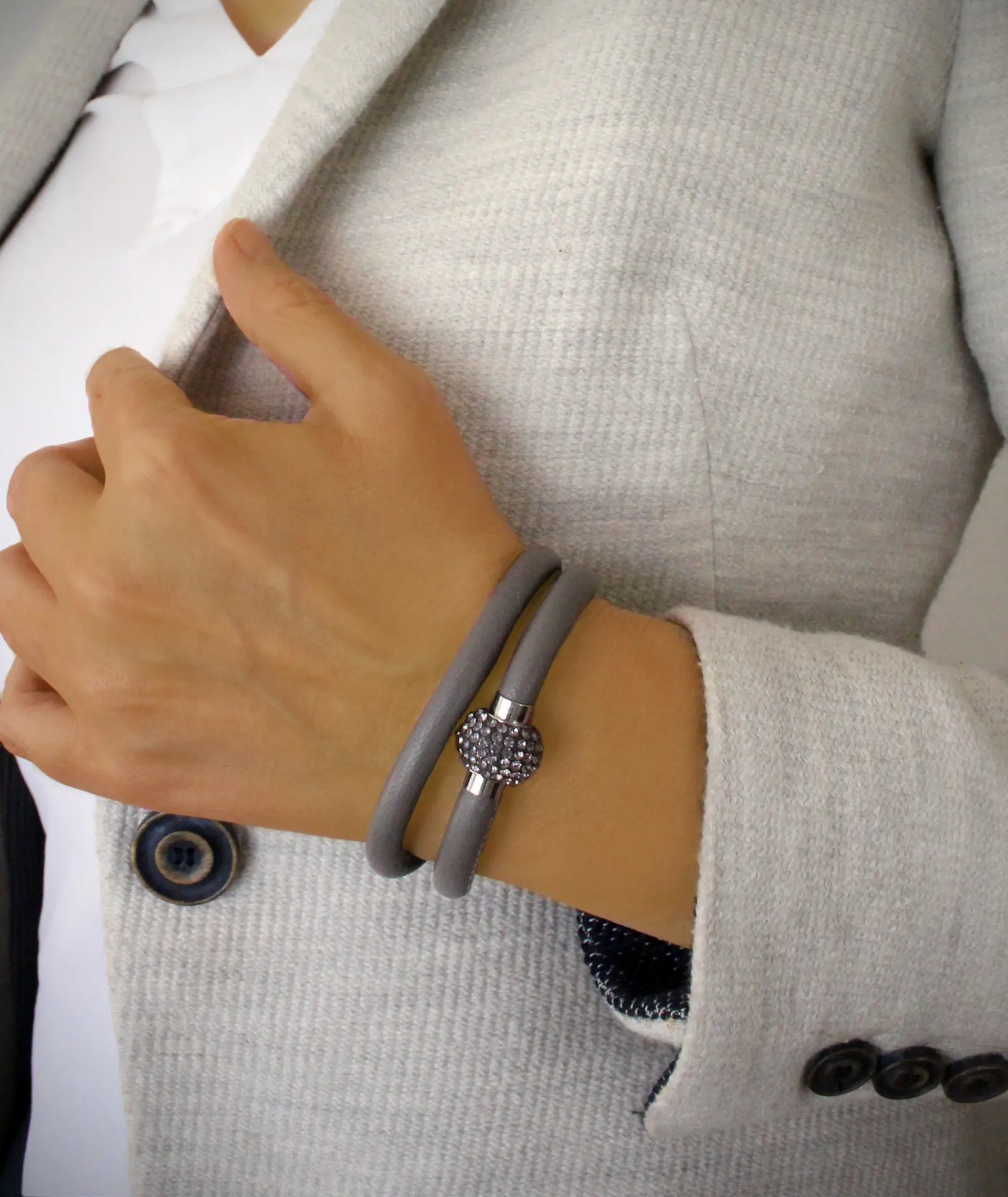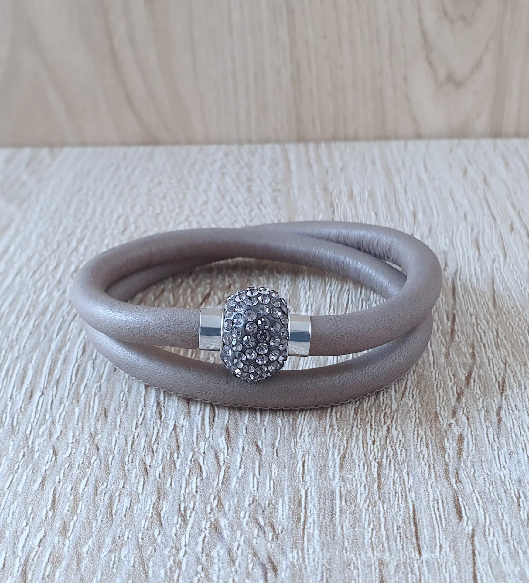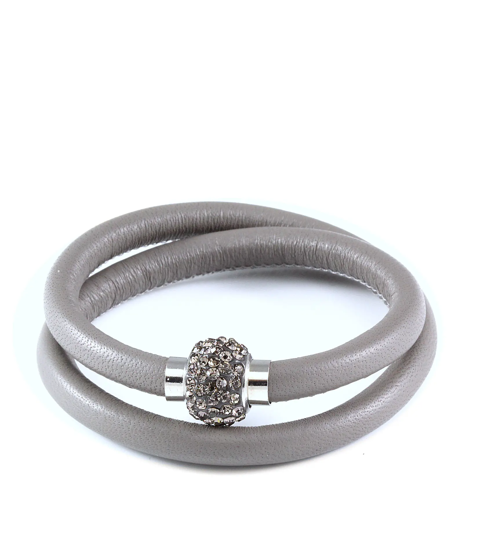 This grey double-wrap leather bracelet, embellished with sparkling Austrian crystals, is an eye-catching addition to a chic outfit. The magnetic lock makes it easy to put on and take off. Mix different bracelets to create your unique look.