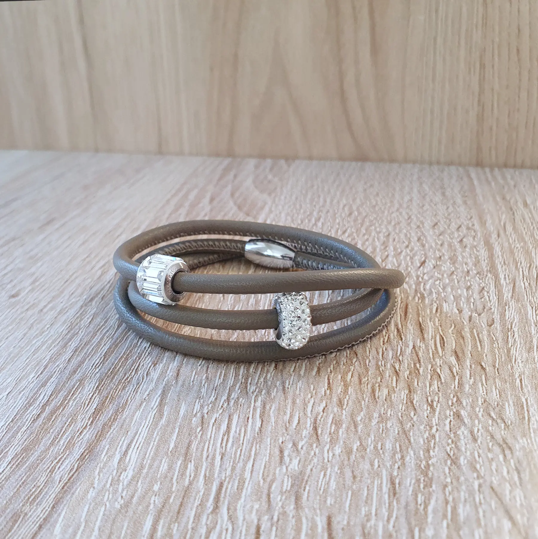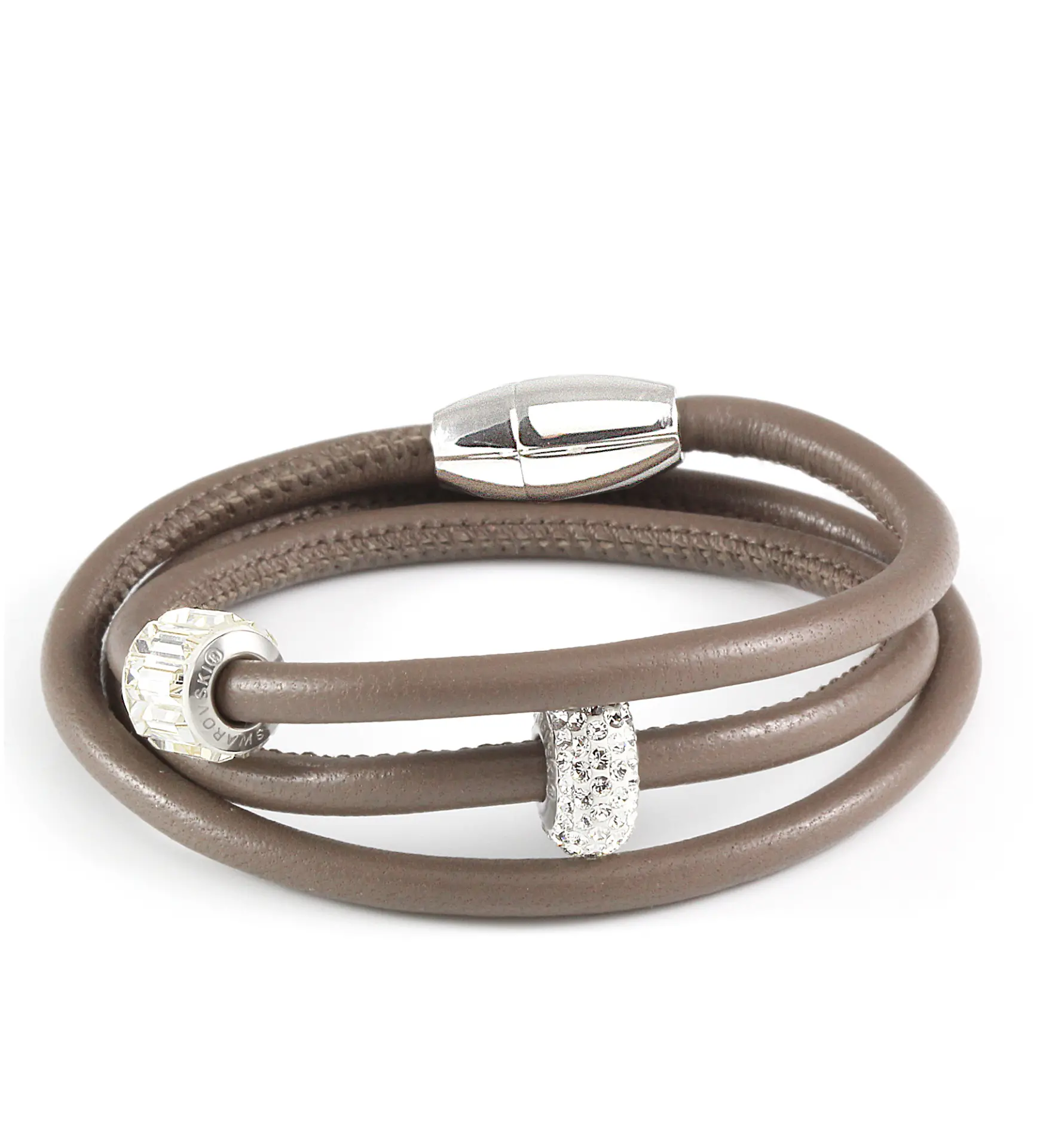 This taupe triple-wrap Nappa leather bracelet, embellished with sparkling Austrian clear crystals, has a gorgeous design that will add a luxurious and elegant sparkle to any outfit. The magnetic lock makes it very easy to put on and take off. An excellent gift for special occasions.