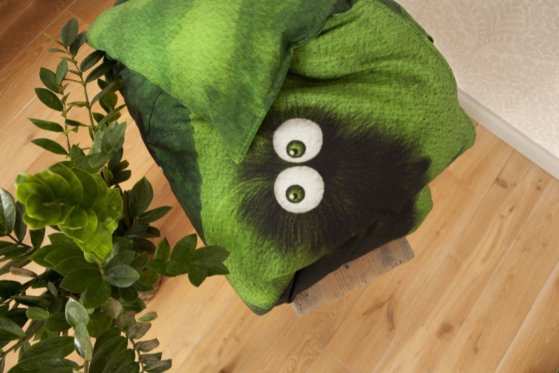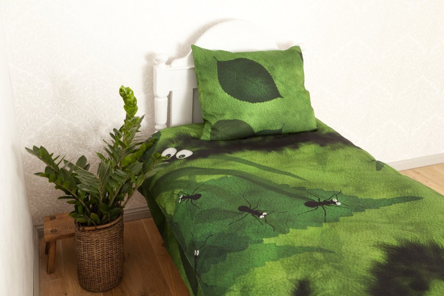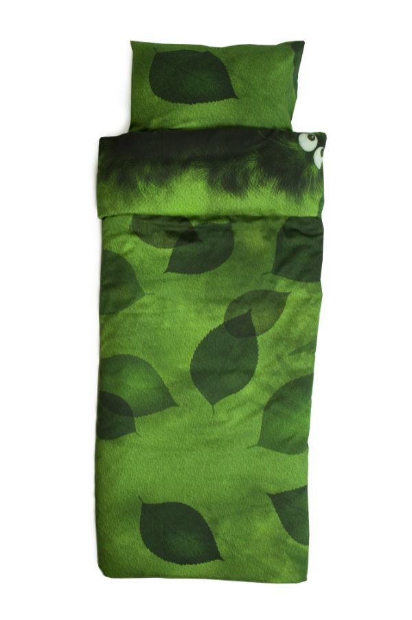 The bedding set Greenery I consists of a duvet cover and a pillowcase made of thin, soft, skin friendly 100% cotton satin. One side of the duvet cover has a big picture of a friendly fluffy curled-up caterpillars, the backside shows leaves and foliage. Both sides of the pillowcase feature beautiful images of leaves and grasses. The fabric for this set is designed in Estonia by Lumimari.