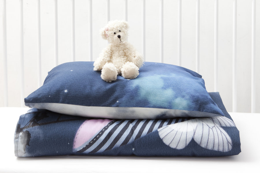 The duvet cover’s dimensions are 100 cm x 135 cm, the pillowcase is 40 cm x 60 cm. The duvet cover and pillowcase can be washed at 60 degrees and may be tumble dried. During the first washing the product may shrink up to 6%.