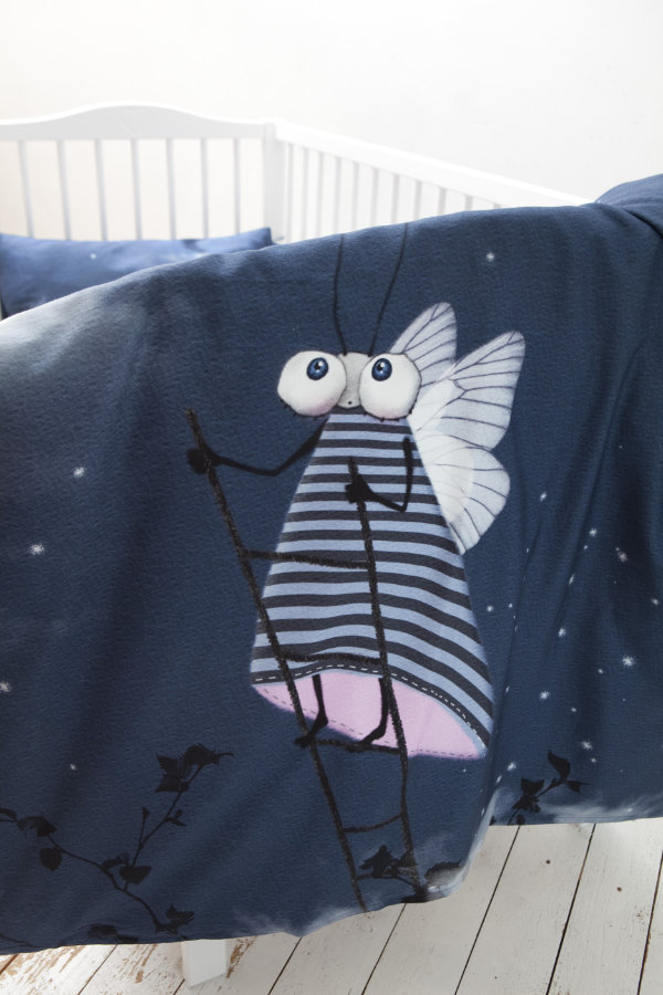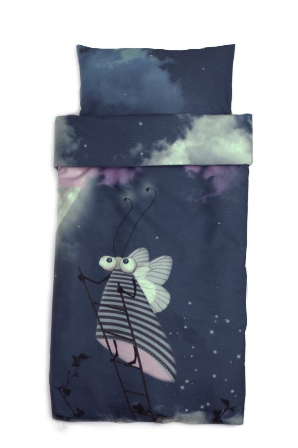 Toddler’s bedding set Full moon I consists of a duvet cover and a pillowcase, manufactured from thin, soft, skin friendly 100% cotton satin. One side of the duvet cover features a large picture of a fairy tale character; the back side shows a starry night sky with clouds. The fabric for this set is designed in Estonia by Lumimari. Being packed in a gift box, this unique set makes a perfect present.