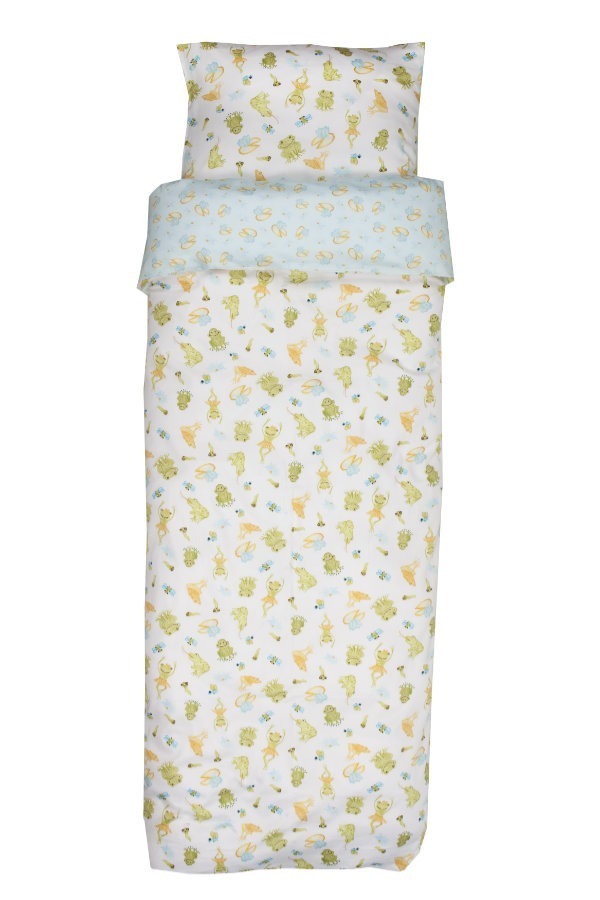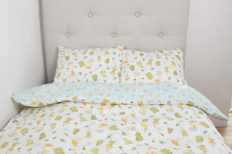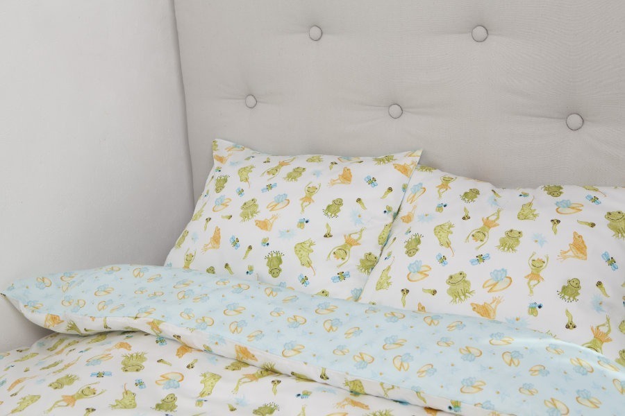 Tekikoti ühel poolel lõbusad konnakesed, tekikoti teisel poolel on vesiroosid kaunil sinisel taustal. Sama mustriga on ka padjapüür.