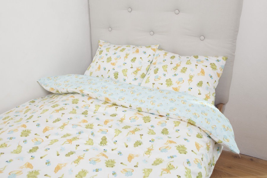 Samad kunstnikud on Uneleja jaoks loonud ka laste voodipesu komplekti Konnad roosade vesiroosidega.
