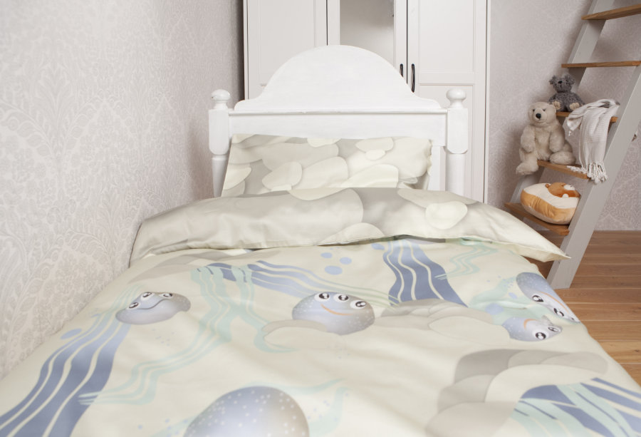 Tekikoti ühel poolel on suur pilt lõbusatest pallikestest lainetes, teisel pool erinevates helehallides toonides kivikesed. Padjapüüri mõlemal poolel on samuti kujutatud kivikesi. Komplekti kangas on disainitud Taanis, disaineriks Kristel Laurits Eestist (www.kristellaurits.com).