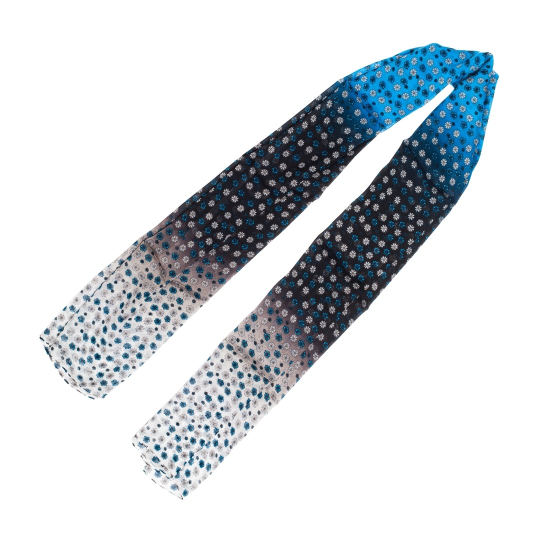 Siidist sall – õhukesest siidist kergelt läbipaistev sini-must-valge sall rukkilillede ja karikakardega.