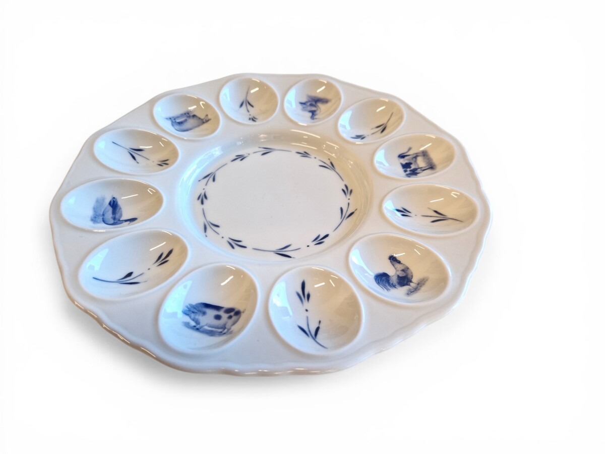 Piltidega munataldrik paistab silma oma õrna ja detailse kujundusega. Sinised illustratsioonid, mis kaunistavad iga munapesa, annavad taldrikule klassikalise ja veidi nostalgilise ilme. Need väikesed pildid loovad ainulaadse visuaalse terviku, mis köidab pilku ja lisab lauale isikupära. Selline disain sobib suurepäraselt nii traditsioonilise kui ka modernse sisekujundusega.