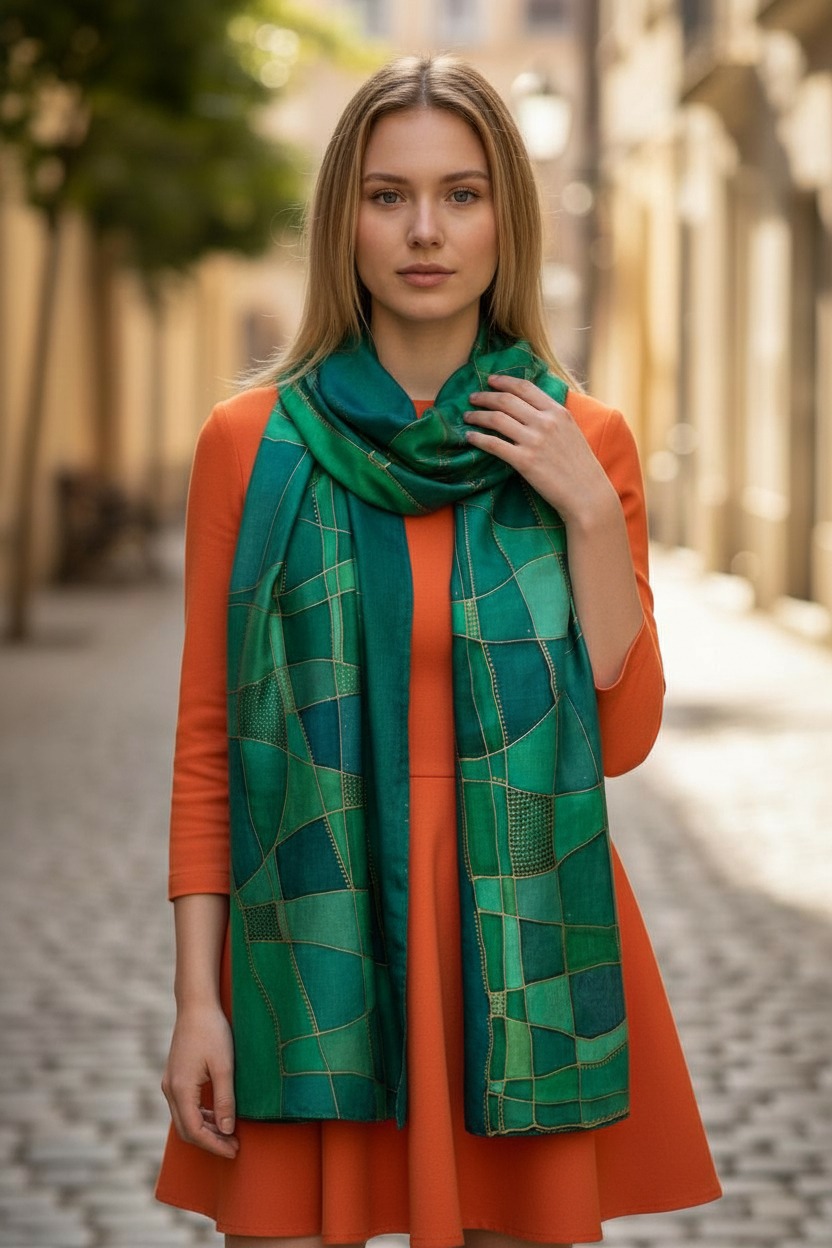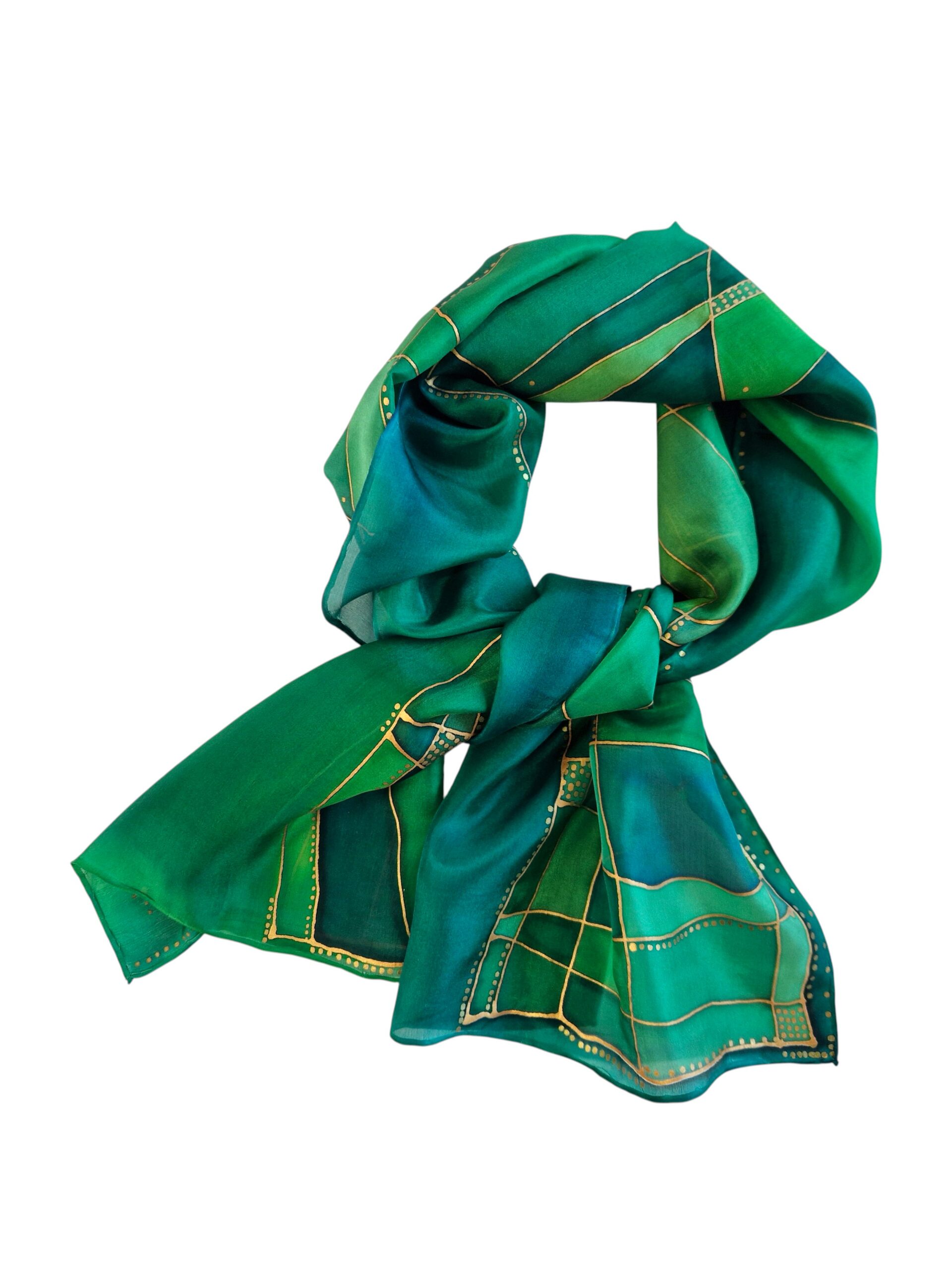 See elegantne käsitsimaalitud siidsall on ainulaadne kunstiteos, mis ühendab endas looduse rahuliku rohelise värvipaleti ja peene kuldse mustrimängu. Salli pind on kaunistatud vabakäeliste joonte ja täpiliste detailidega, mis loovad modernse, kuid ajatu kompositsiooni.
