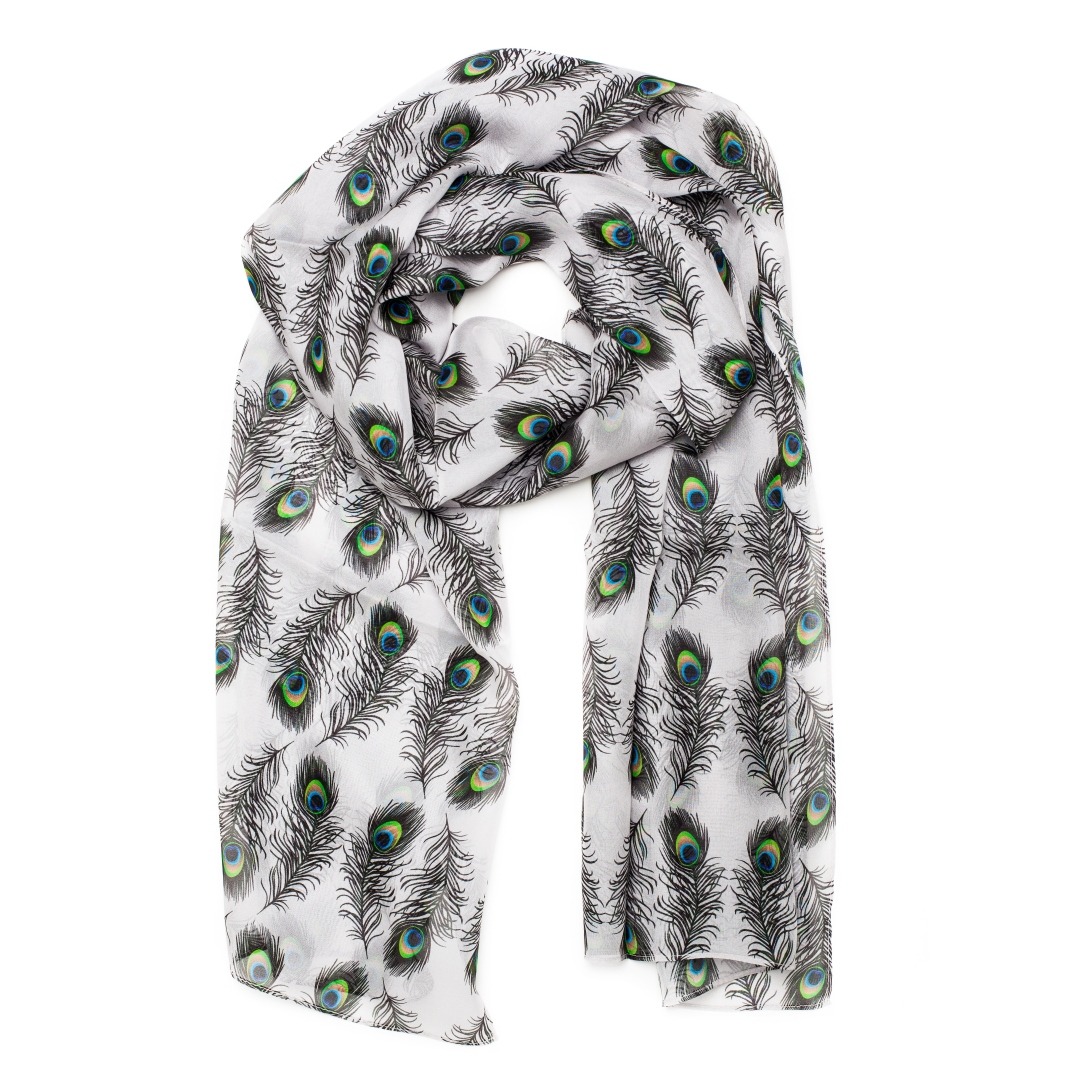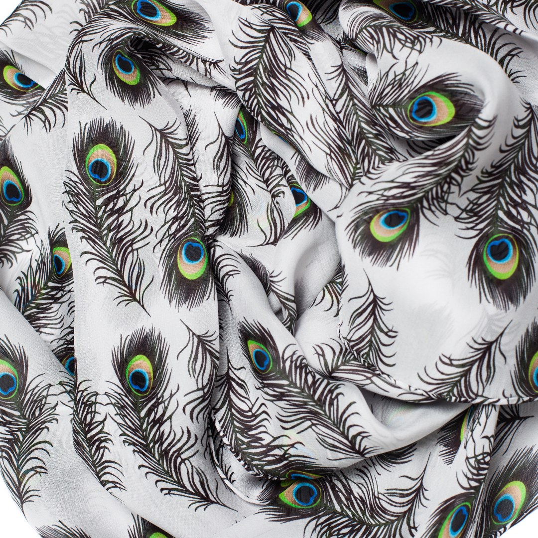 Õhukesest siidist kergelt läbipaistev hall sall paabulinnu sulgedega brändilt BSURD.