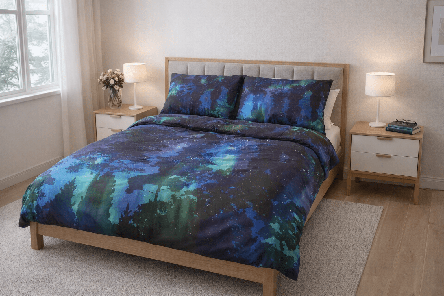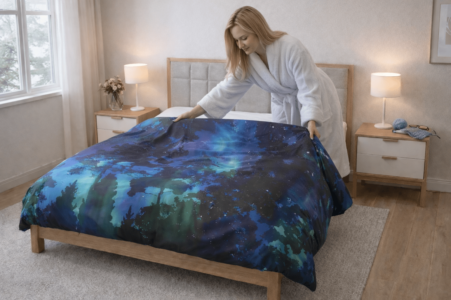 Suur voodipesukomplekt Virmalised on lummav valik neile, kes soovivad tuua magamistuppa põhjamaist müstikat, rahu ja luksuslikku mugavust.