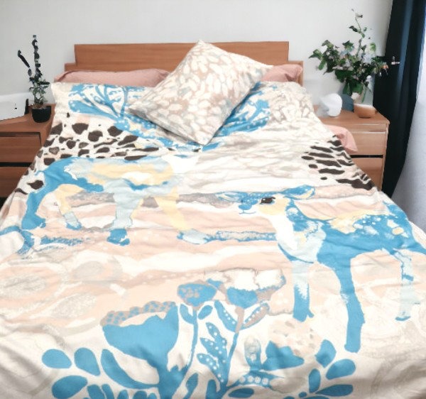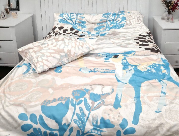 Voodipesu komplekt Võlumets 2 on kaunistuseks igas magamistoas: tekikoti ühel poolel on suur pilt hirvest ja hirvevasikast helesinise metsa ja tumepruunide põõsaste taustal.