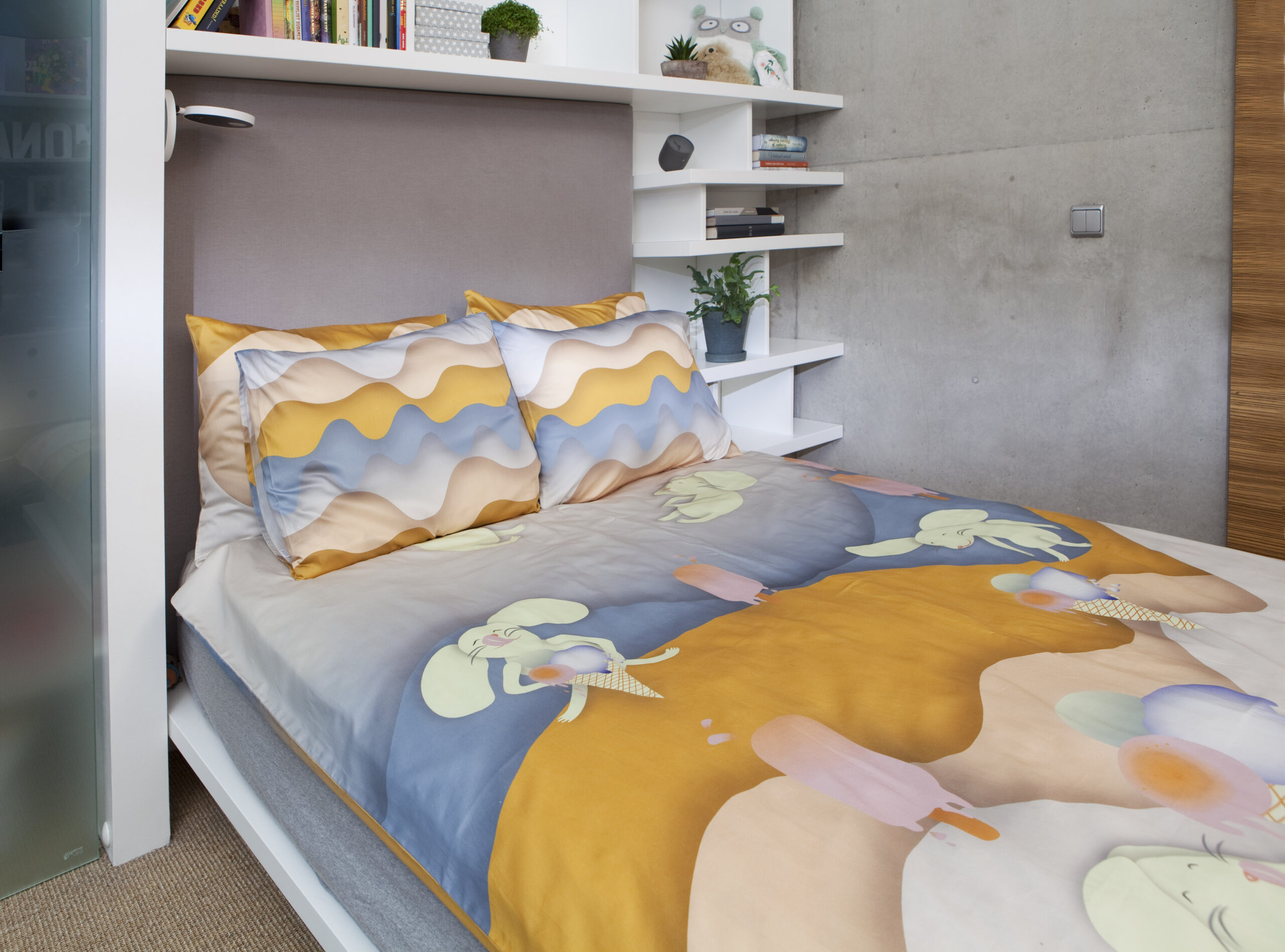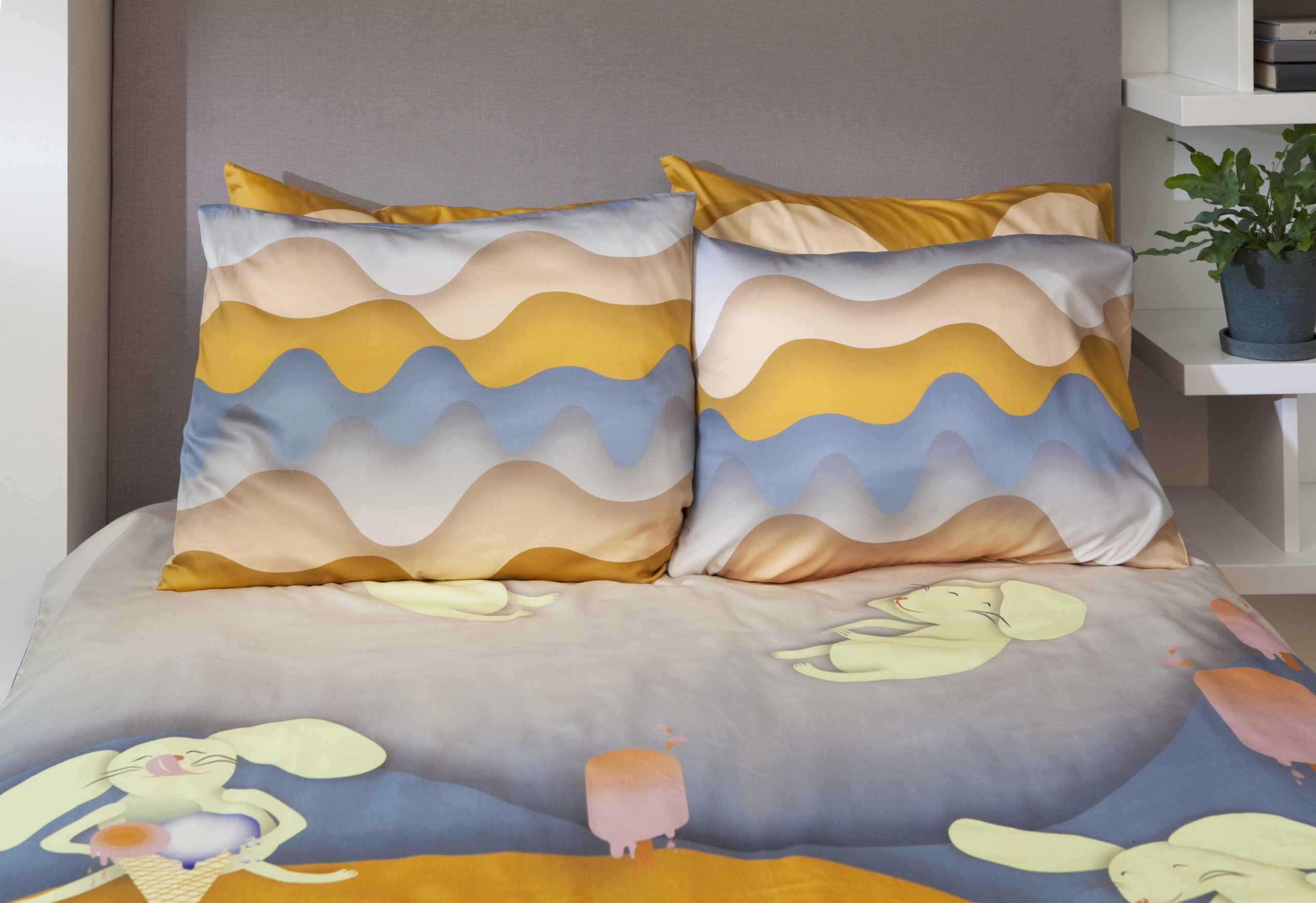 Tekikoti ühel poolel on pilt lõbusatest hiirekestest ja jäätistest. Tekikoti teisel poolel on silmale kaunilt mõjuvad värviüleminekud. Padjapüüril on toredad värvilised lained.