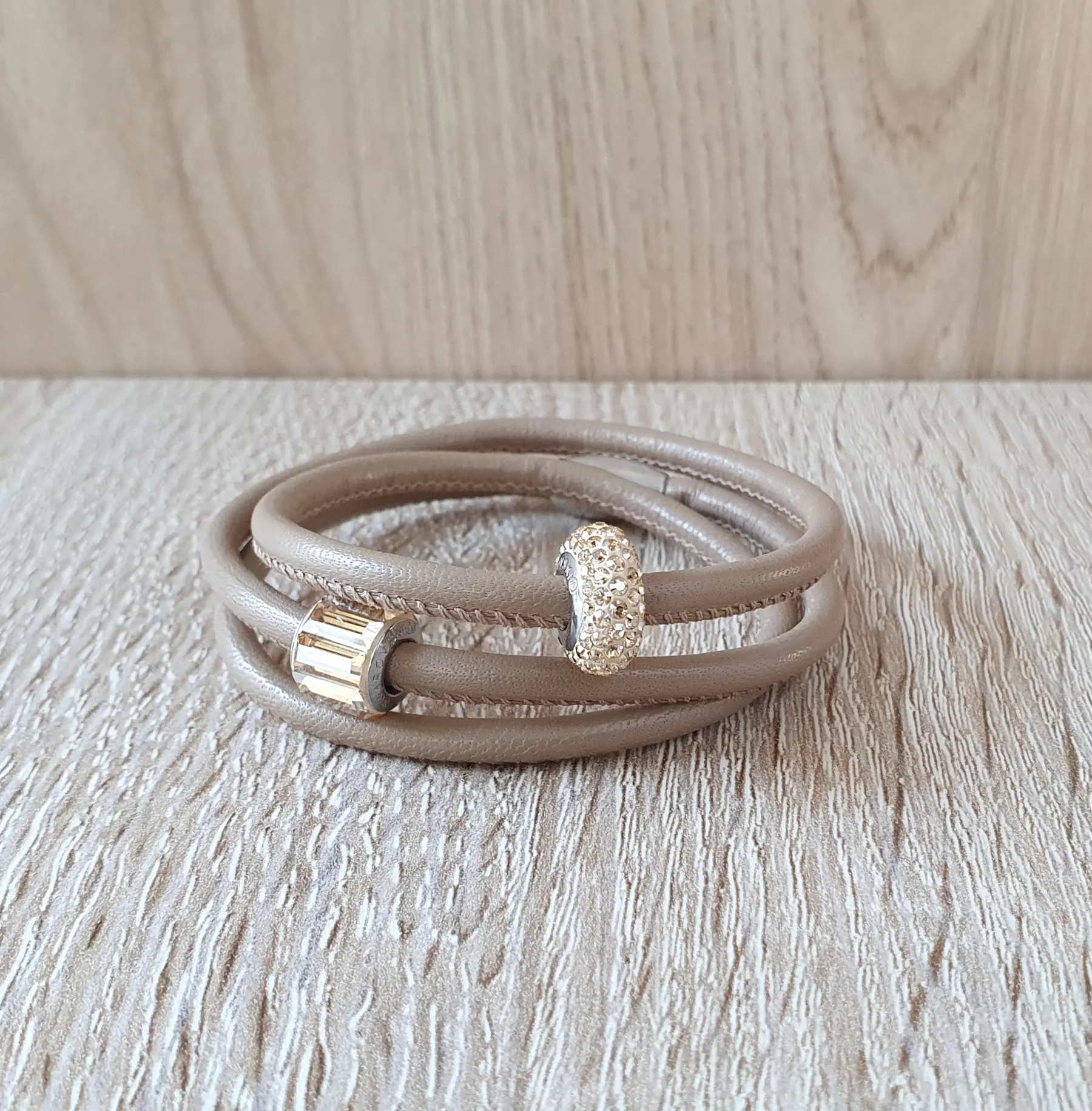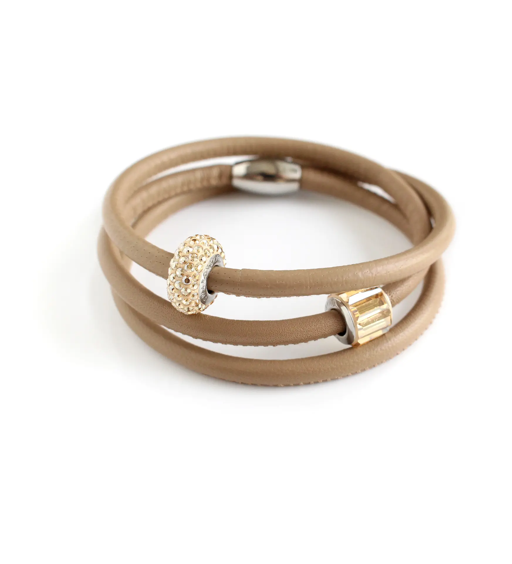 Sparkle to the max in this glamorous, show-stopping beige triple-wrap Nappa leather bracelet. Beautifully handcrafted and embellished with shimmering Golden Shadow Austrian pavé crystals, it’s a great choice for striking outfits. Secured with a magnetic lock, it’s easy to put on and take off.