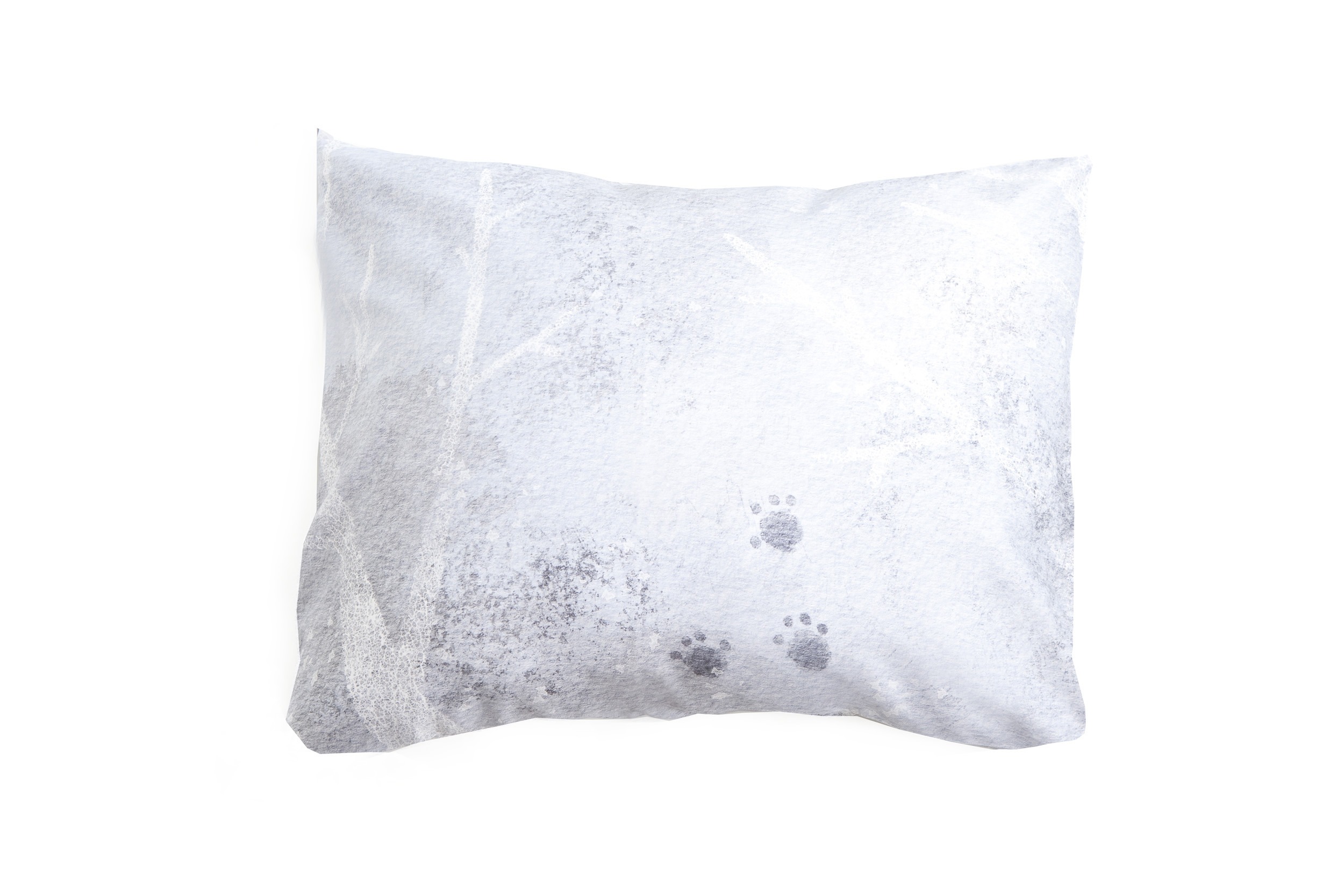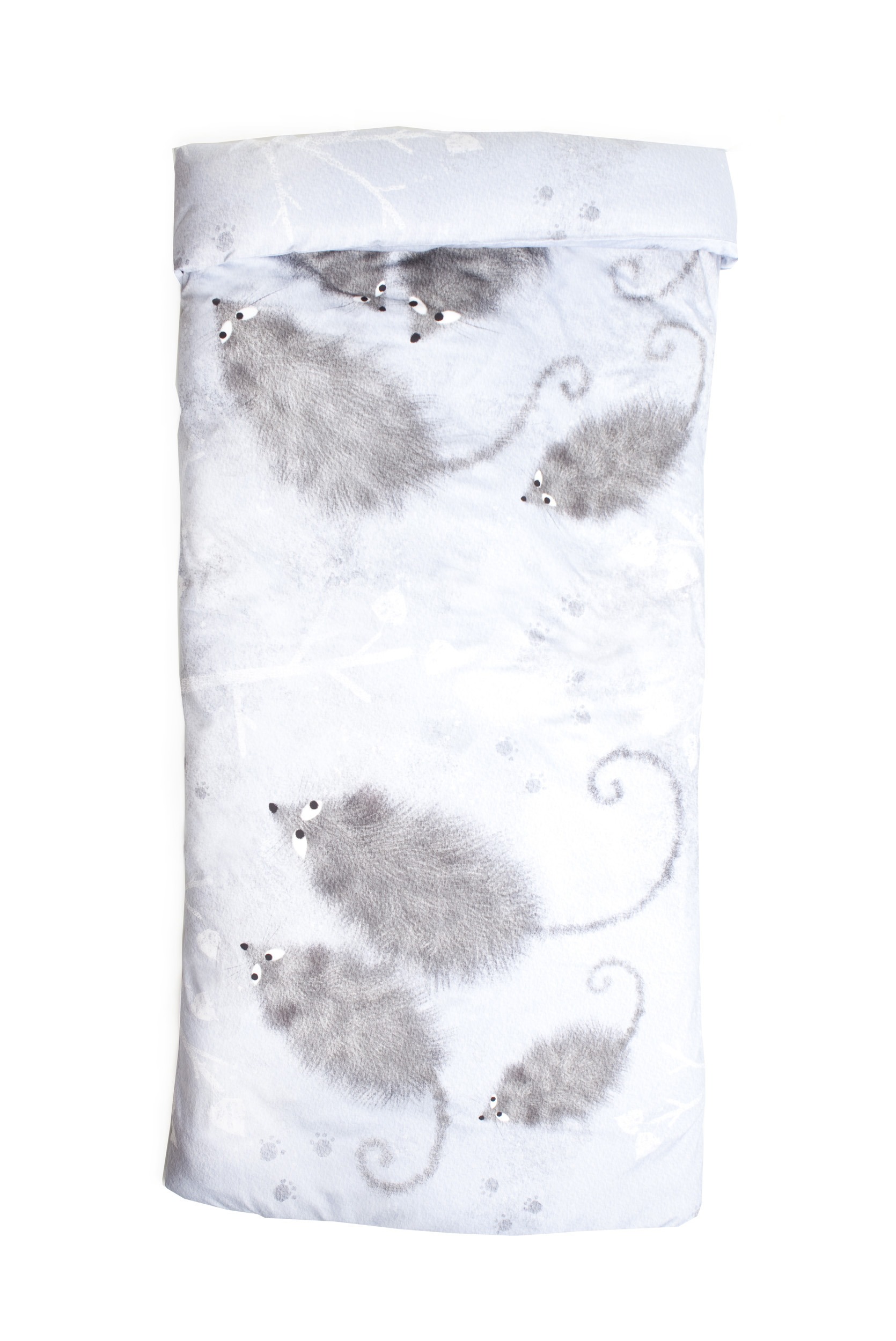 The set consists of a duvet cover and a pillowcase, manufactured from thin, soft, skin friendly 100% cotton satin. On both sides of the duvet cover there is a big picture of cute mice with white branches and pawprints on a pale blue background. The fabric for this set is designed in Estonia by Lumimari (www.lumimari.com).