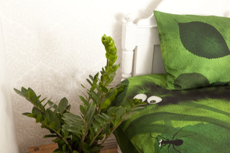 The bedding set Greenery I consists of a duvet cover and a pillowcase made of thin, soft, skin friendly 100% cotton satin. One side of the duvet cover has a big picture of a friendly fluffy curled-up caterpillars, the backside shows leaves and foliage. Both sides of the pillowcase feature beautiful images of leaves and grasses. The fabric for this set is designed in Estonia by Lumimari.