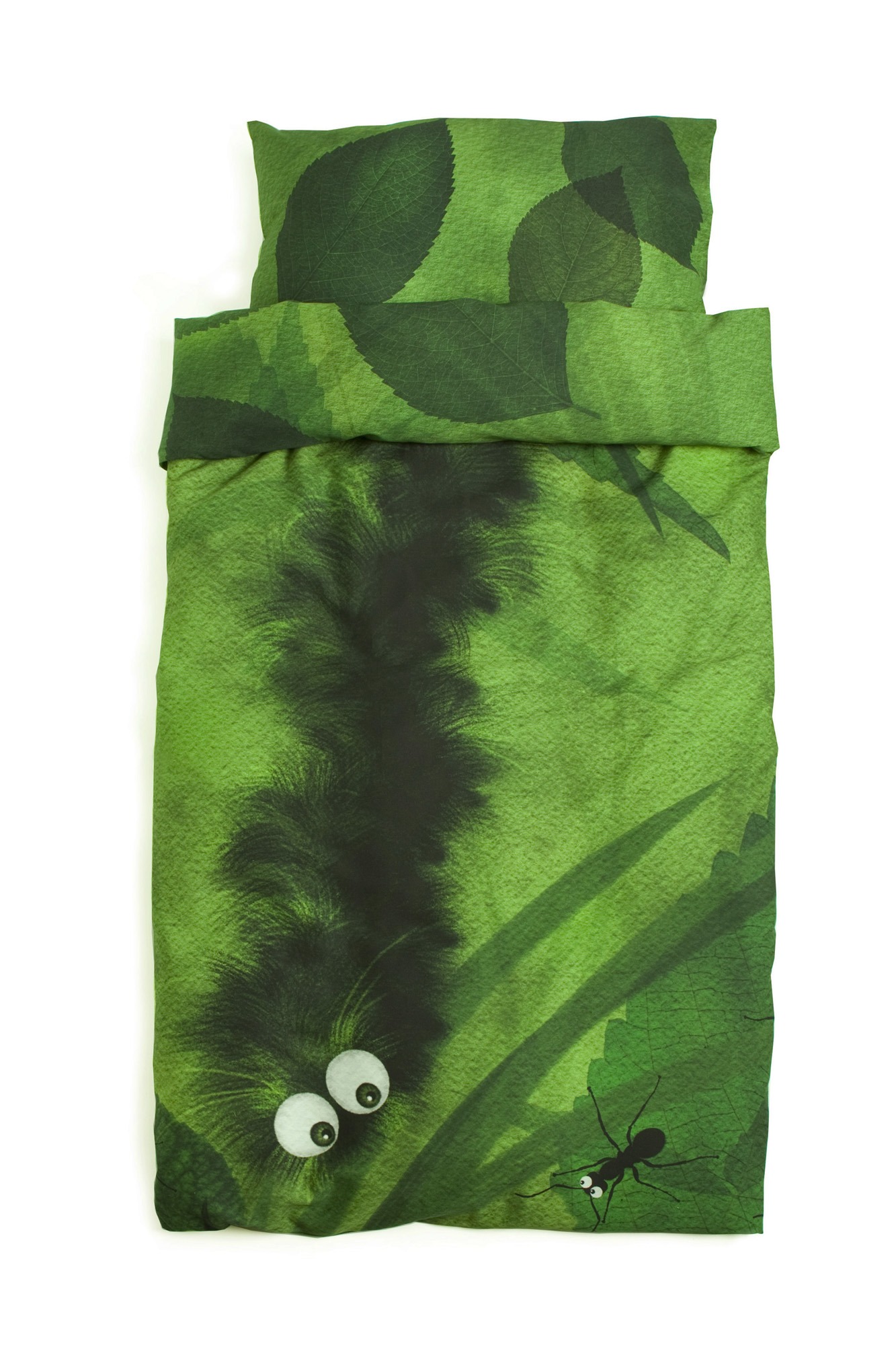 Toddler’s bedding set Greenery II consists of a duvet cover and a pillowcase made of thin, soft, skin friendly 100% cotton satin. One side of the duvet cover has a big picture of a friendly fluffy curled-up caterpillar, the backside shows leaves and foliage. Both sides of the pillowcase feature beautiful images of leaves and grasses. The fabric for this set is designed in Estonia by Lumimari.