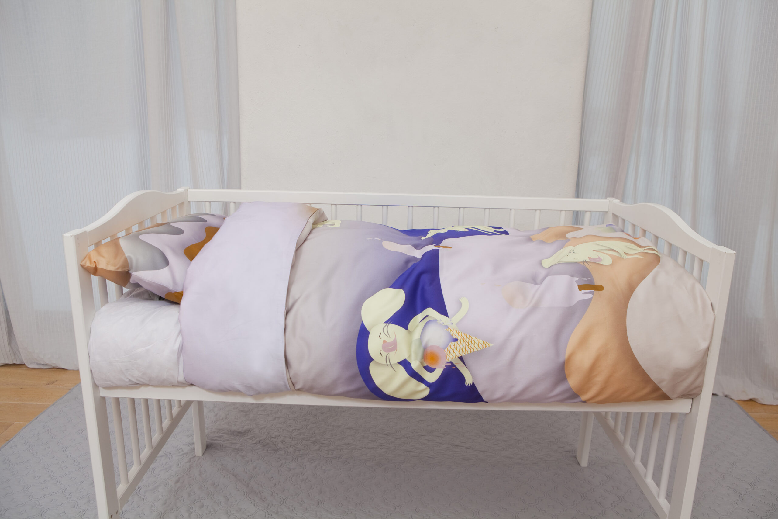 Toddler’s bedding set Mice and ice cream consists of a duvet cover and a pillowcase, manufactured from thin, soft, skin friendly 100% cotton satin from Italy.