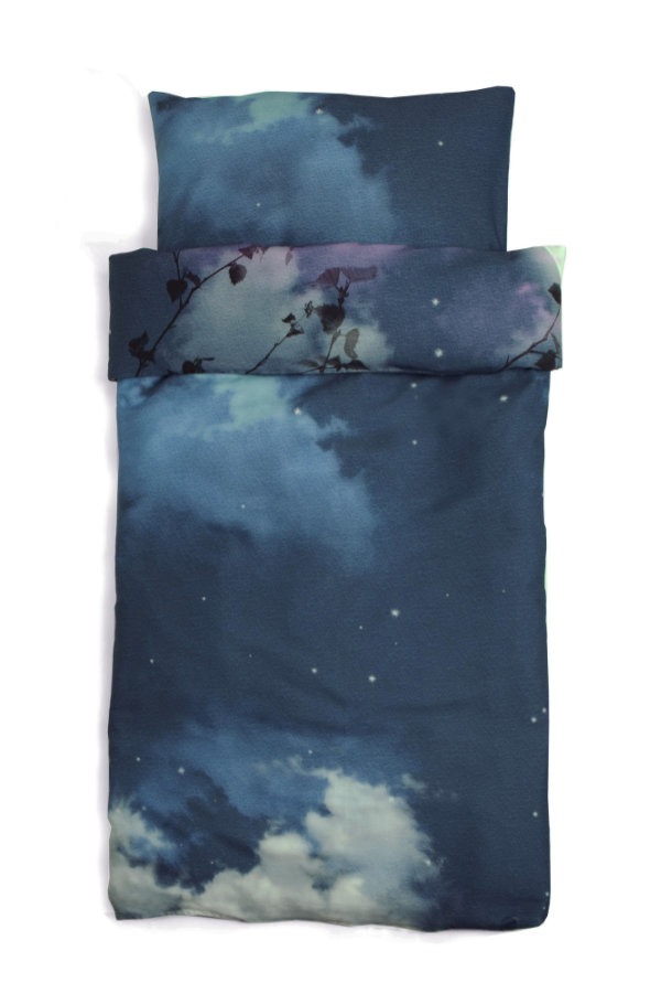 Toddler’s bedding set Full moon I consists of a duvet cover and a pillowcase, manufactured from thin, soft, skin friendly 100% cotton satin. One side of the duvet cover features a large picture of a fairy tale character; the back side shows a starry night sky with clouds. The fabric for this set is designed in Estonia by Lumimari. Being packed in a gift box, this unique set makes a perfect present.