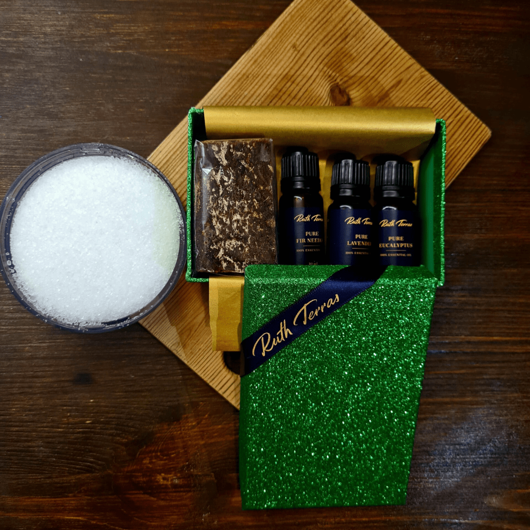 - 3x10ml eeterliku õli või eeterlike õlide segu. Selles komplektis on järgmised eeterlikud õlid: eukalüpt, 2.48 a.m. (sidrunhein, ingver, piparmümt, eukalüpt), 6.07 a.m. (kuusk ja apelsin).
