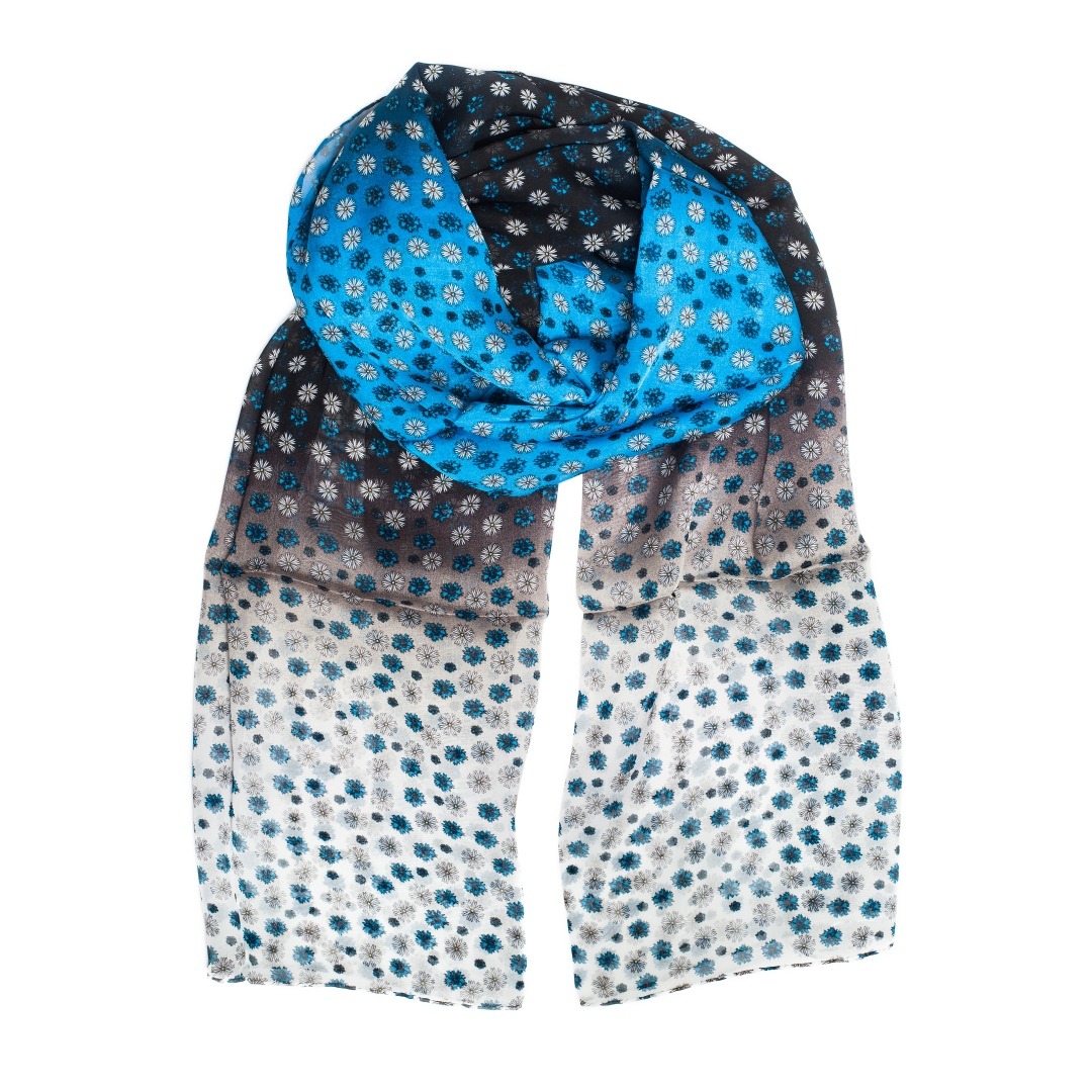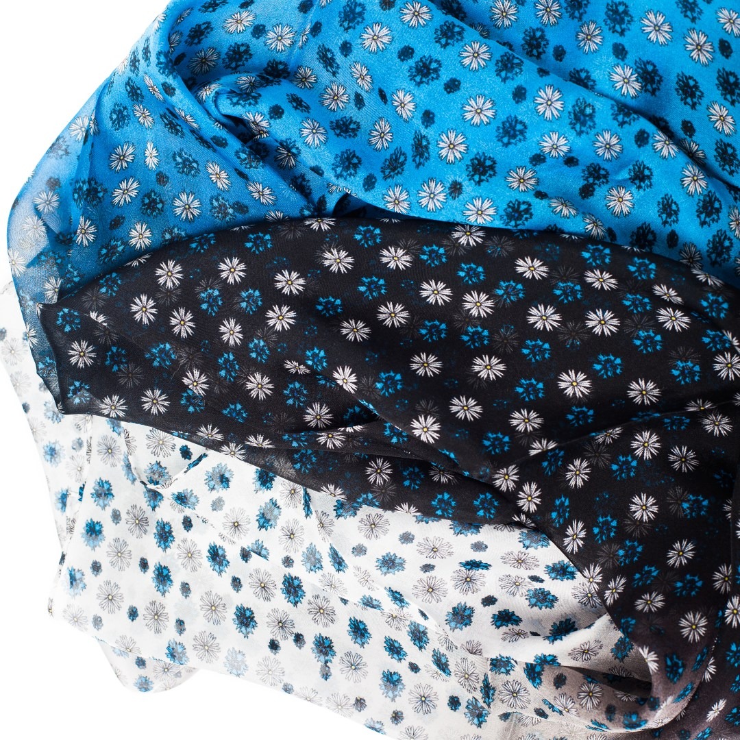 Siidist sall – õhukesest siidist kergelt läbipaistev sini-must-valge sall rukkilillede ja karikakardega.