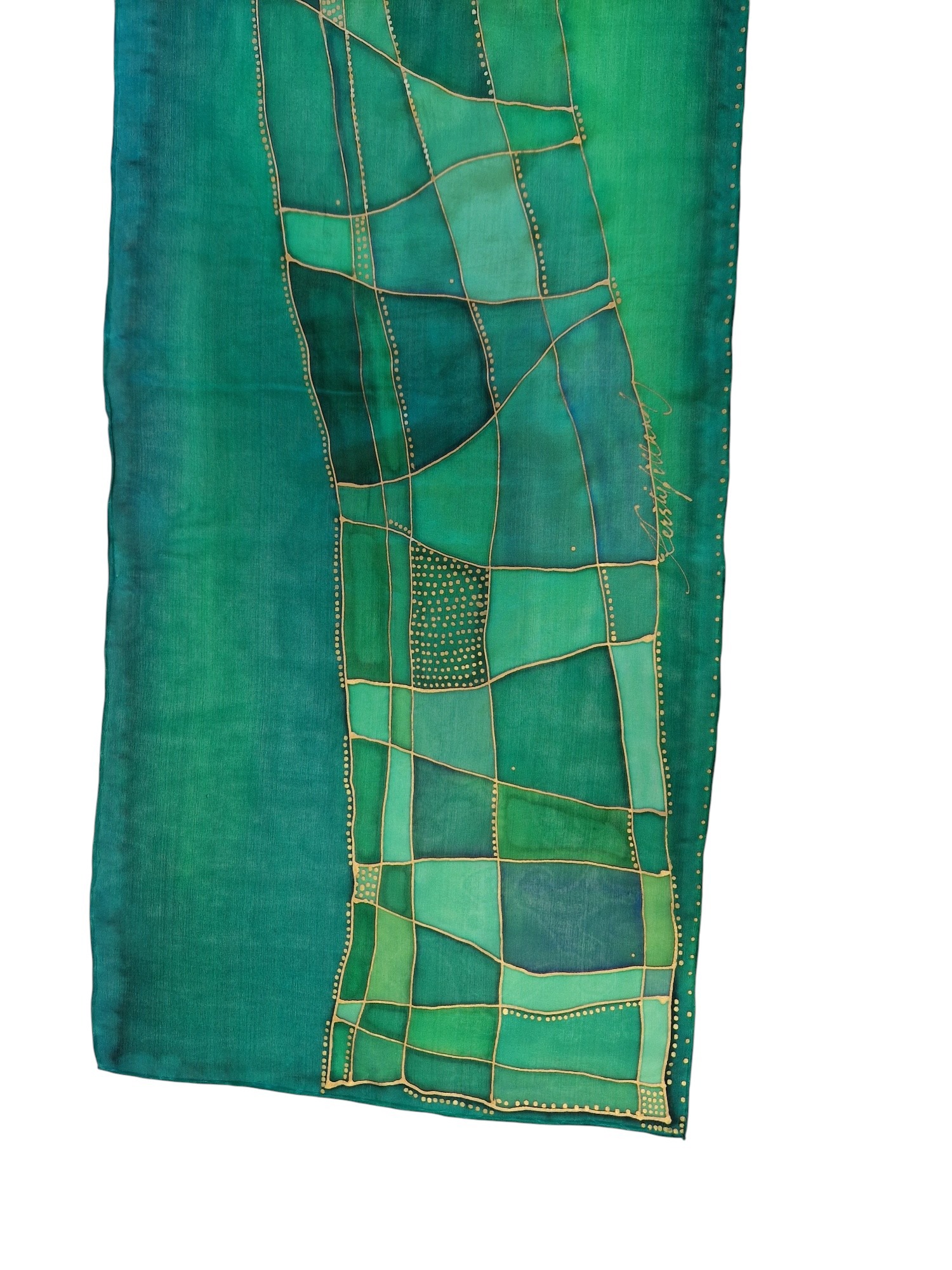 See elegantne käsitsimaalitud siidsall on ainulaadne kunstiteos, mis ühendab endas looduse rahuliku rohelise värvipaleti ja peene kuldse mustrimängu. Salli pind on kaunistatud vabakäeliste joonte ja täpiliste detailidega, mis loovad modernse, kuid ajatu kompositsiooni.