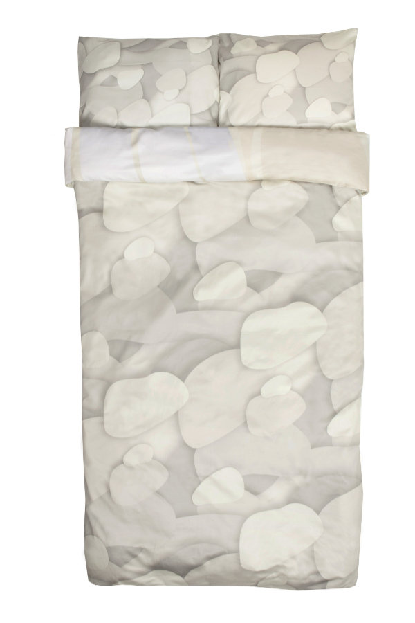 Tekikoti ühel poolel on suur abstraktne pilt lainetusest, teisel pool erinevates helehallides toonides kivikesed. Kahe padjapüüri mõlemal poolel on samuti kujutatud kivikesi, kahel ülejäänul on ühel pool kokkusobiv abstraktne muster.