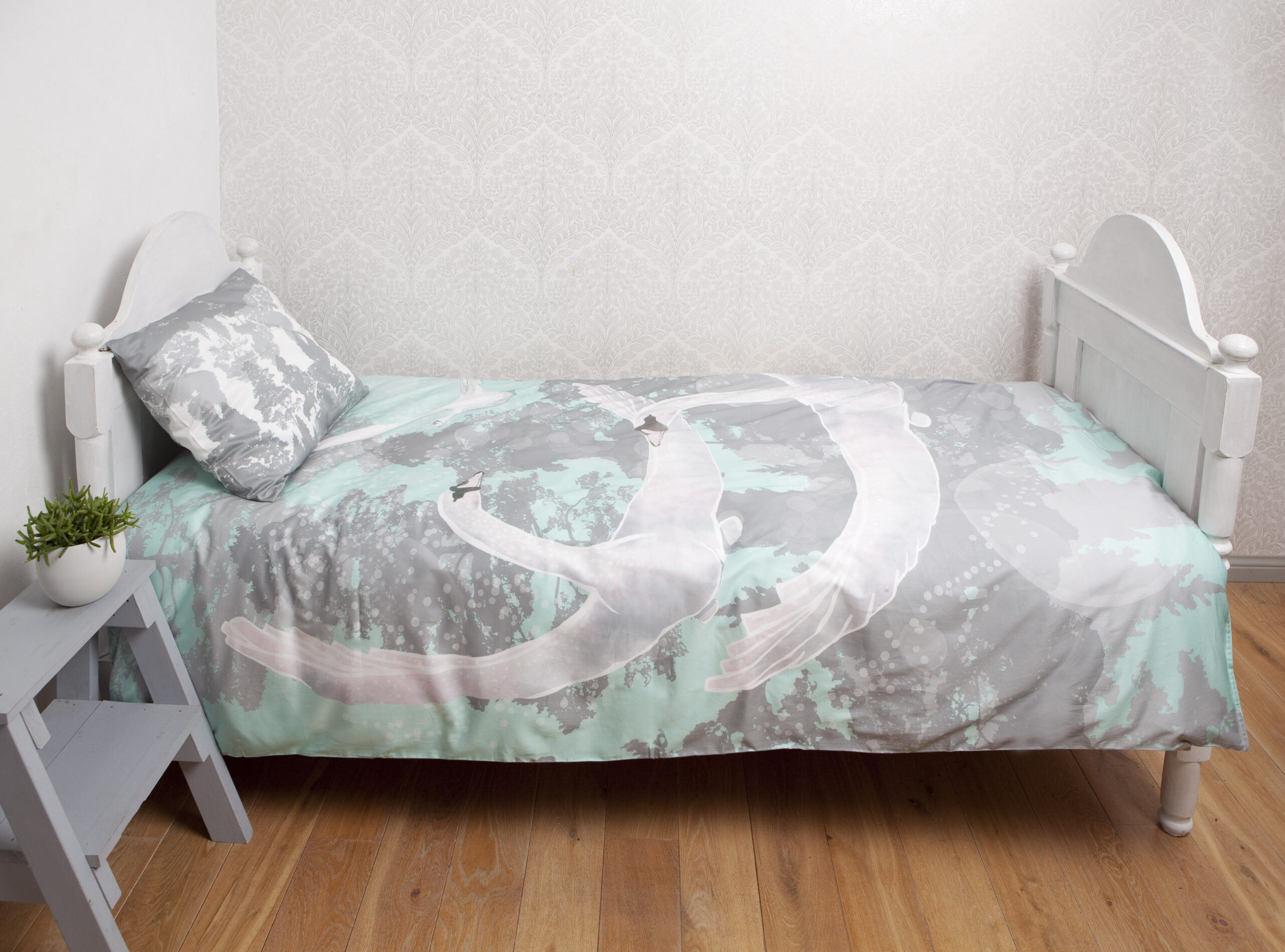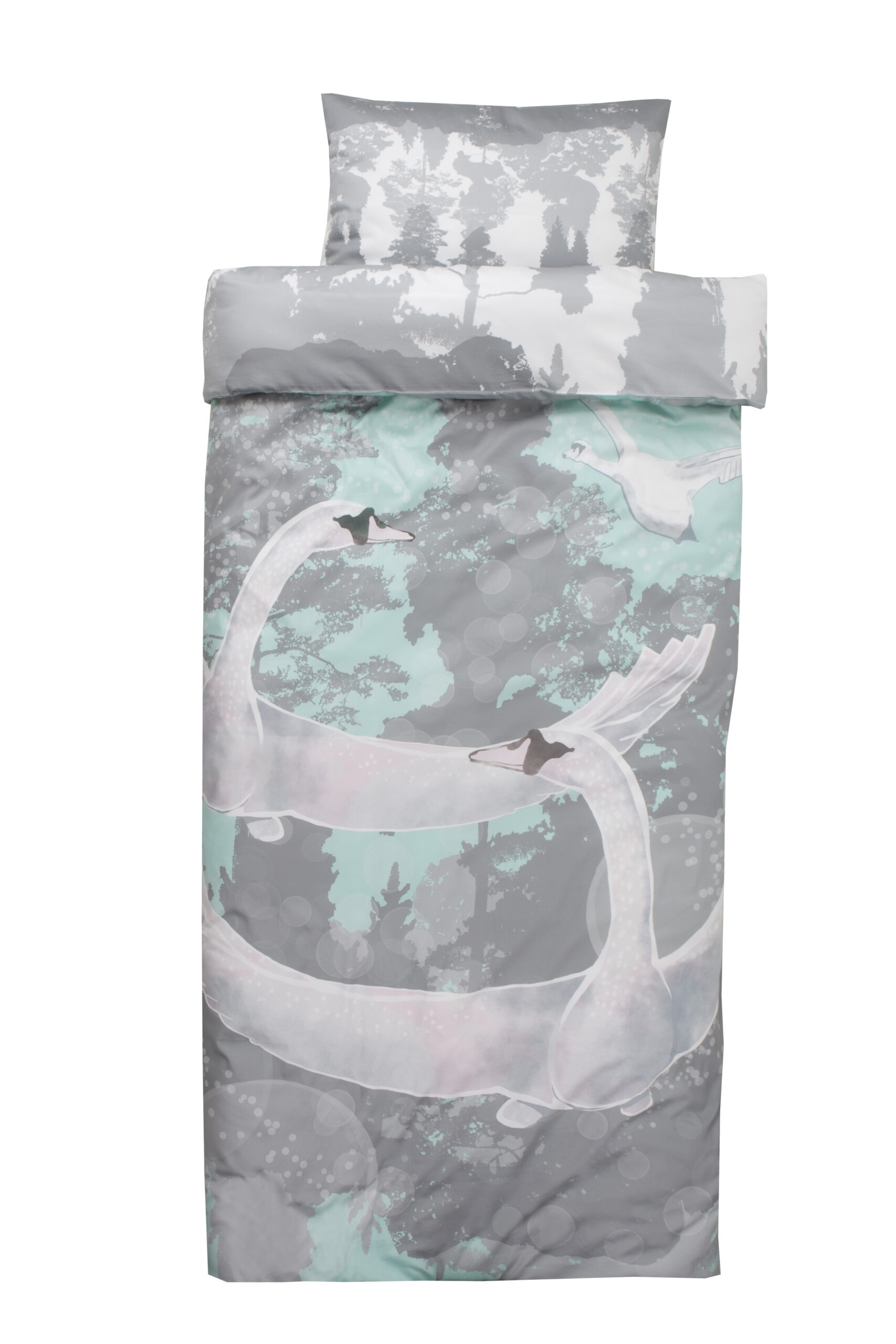 Tekikoti ühel poolel on suur pilt luikedest sinaka-halli metsa taustal. Tekikoti teisel poolel on põhjamaiselt hall metsamuster, sama mustriga on ka padjapüür.
